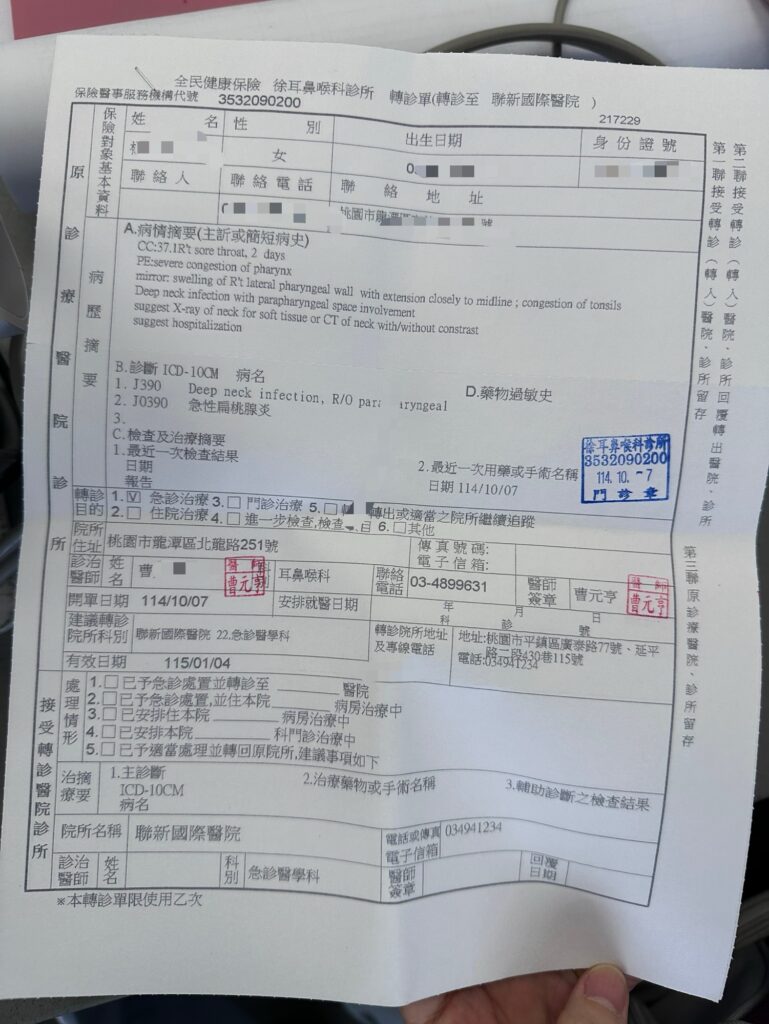連續兩個假期王馬麻往台中、台南跑總覺得喉嚨有點不適與耳後近下顎漲痛,在回家後隔天上完瑜珈課後便前往耳鼻喉科就診,沒想到醫生開出了轉診單,還說可能需要住院。